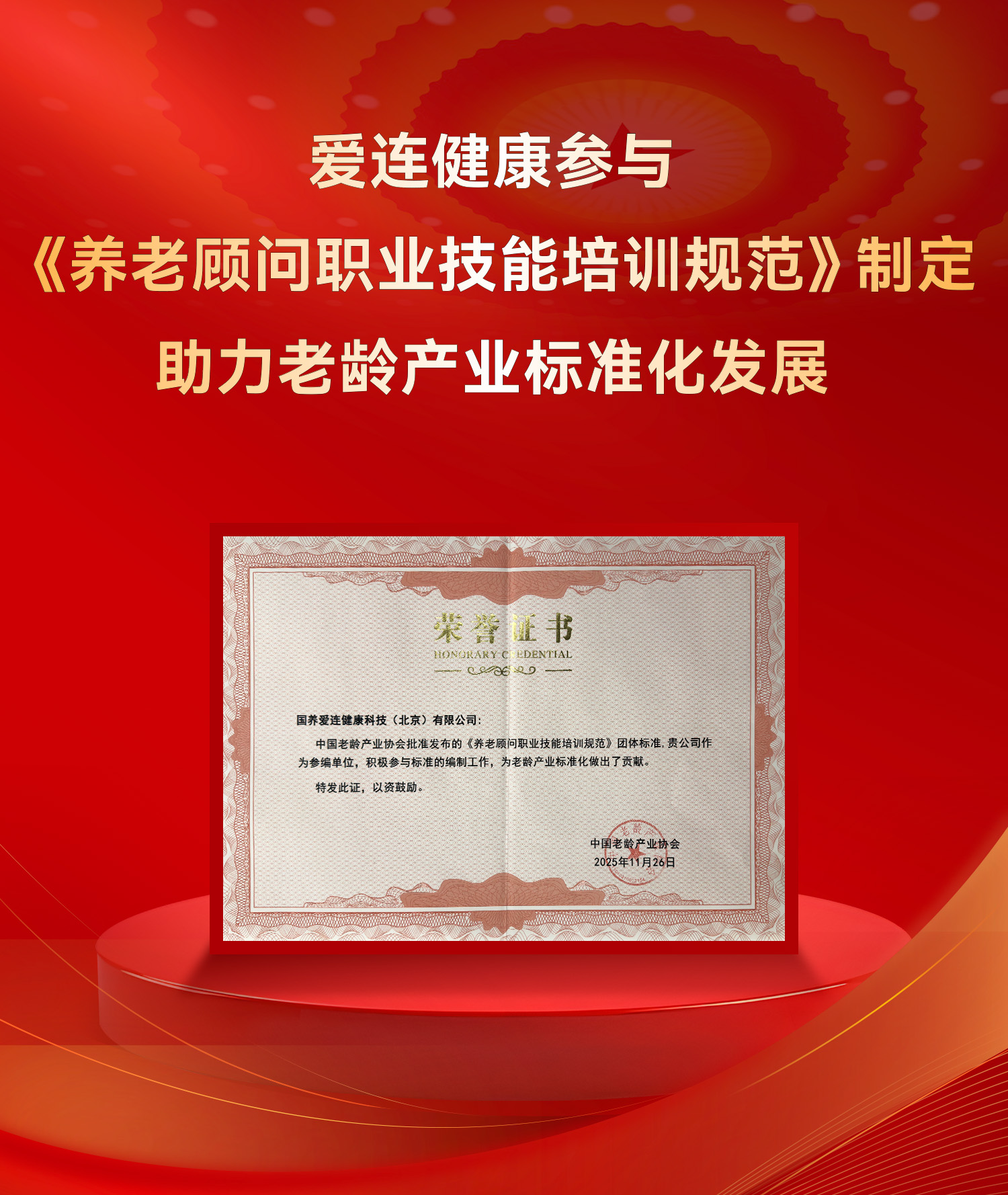 近日,由人力资源和社会保障部能力建设中心主导,并与中国老龄产业协会共同牵头,中国老龄产业协会医养结合与健康管理工作委员会具体执行的《养老顾问职业技能培训规范》等三项团体标准发布并实施。爱连健康凭借创新