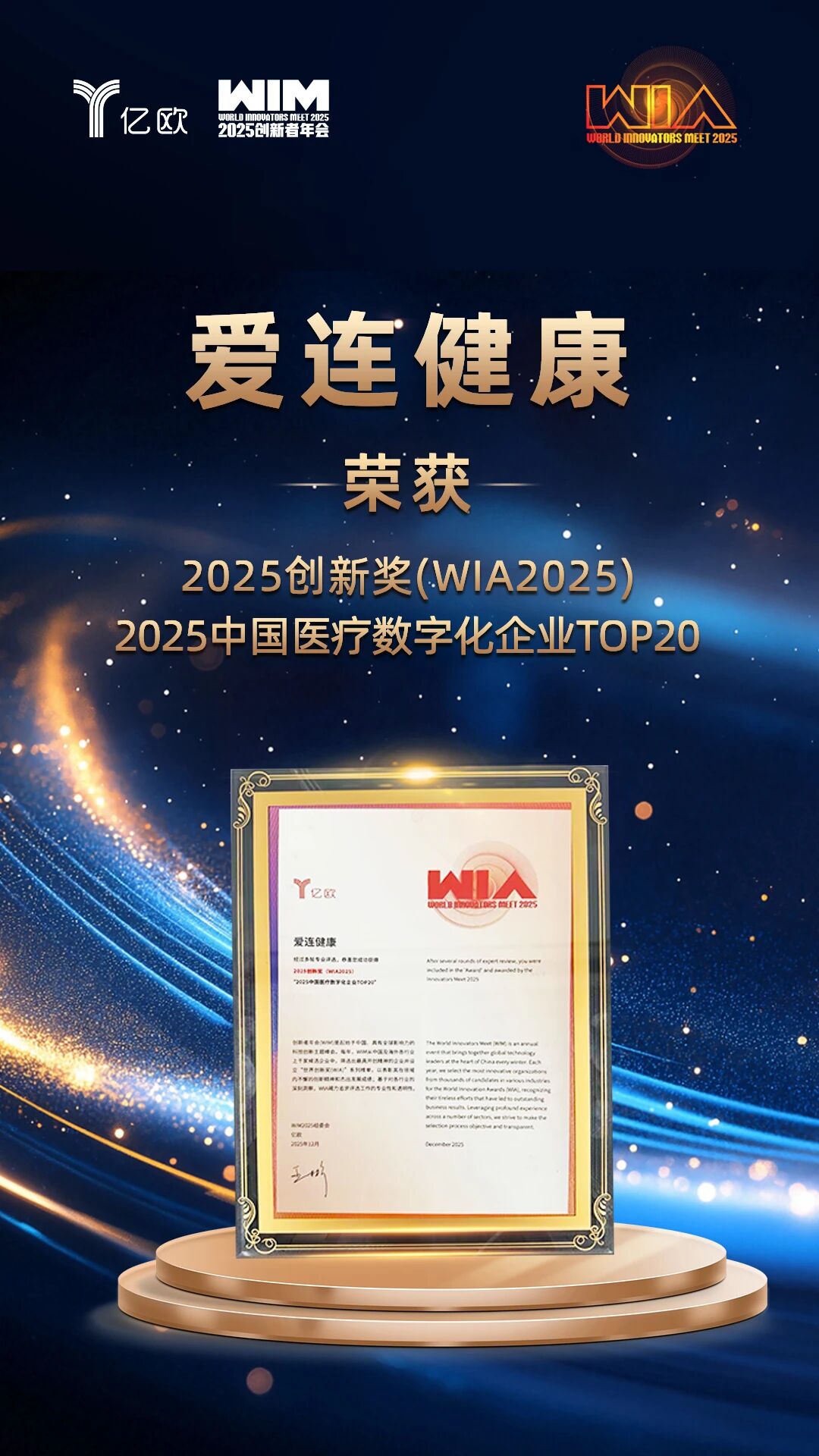 近日,在由知名科技与产业创新研究机构亿欧主办的“WIM2025创新者年会”上,业界瞩目的年度权威榜单《2025中国医疗数字化企业TOP20》隆重发布。爱连健康凭借在医疗健康领域扎实的全链路数字化基建、